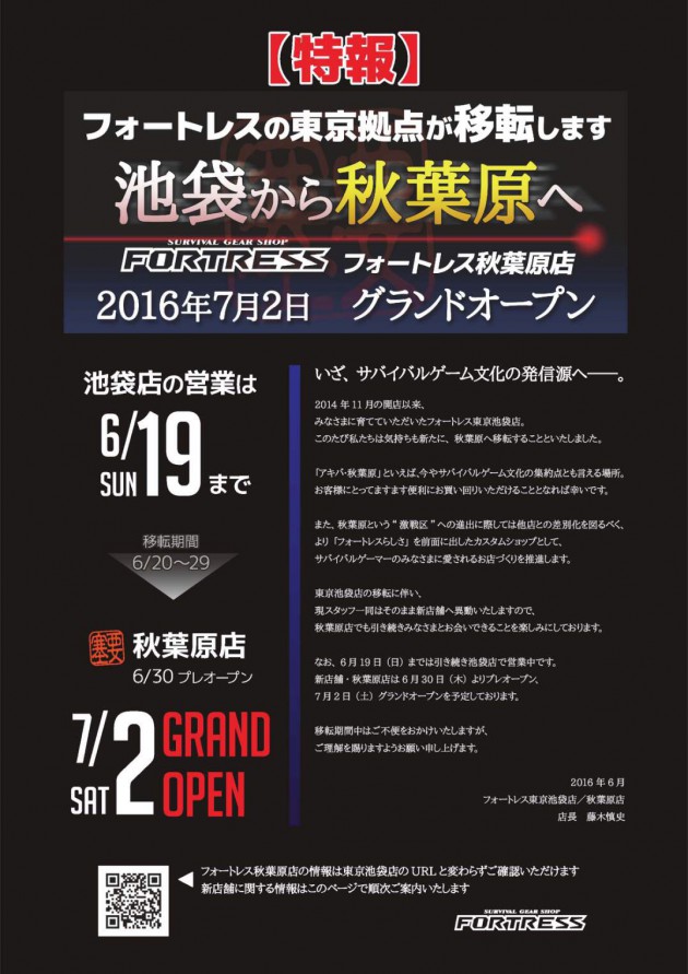 エアガンショップ 『フォートレス』が秋葉原に移転!! 2016.06.13 ショップ 要塞こと、エアガンショップのフォートレスが現在の池袋から秋葉原へと移転するそうです!! 7/2(土)、グランドオープンです。 場所はASOBIBA秋葉原店の目の前になります。 公式ブログでの告知 http://bukurofortress.militaryblog.jp/e773540.html この記事が役に立ったら、ぜひシェアしてください。 Post 関連記事 2014.07.07 ファントムAKIBA ラジ館店が7/20にオープン!! 2013.10.28 サイリウムで夜戦 2013.10.31 定番商品って 2013.05.04 シューティングバー サンスター 関連アイテム 東京マルイ H&K MP5A5 電動ガンBOYs [ サブマシンガン(対象年令10才以上) ] サバゲー 電動ガン ライフル マシンガン ネズミ除… 8,130円 東京マルイ スミス&ウェッソン PC356 [ 電動ブローバック フルオート/対象年令10才以上 ] サバゲー 電動ガン ブローバック ネズ… 4,353円 東京マルイ 18歳以上用 電動ハンドガン H&K USP ブラックカラー 【あす楽】 15,800円 東京マルイ ハイキャパE ガバメントモデル 電動ガン ハンドガンタイプ 【あす楽】 17,980円 東京マルイ対応 電動ガン 互換 ミニSバッテリー ニッケル水素 1600mAh【使用時間23%アップ】 [ランキング受賞] 1,969円 Supported by 楽天ウェブサービス もっと「電動ガン」を、 楽天市場で探す | amazonで探す