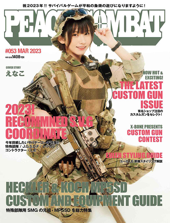 カバーガールは現在放送中のTVドラマ「ドクターX~外科医・大門未知子~」に出演している田中道子さん。タイトブラックの衣装で女性スパイ的なスタイリングに、人気急上昇中の電動ガンKRYTACのLVOA-Sブラックを持ってもらいました。
