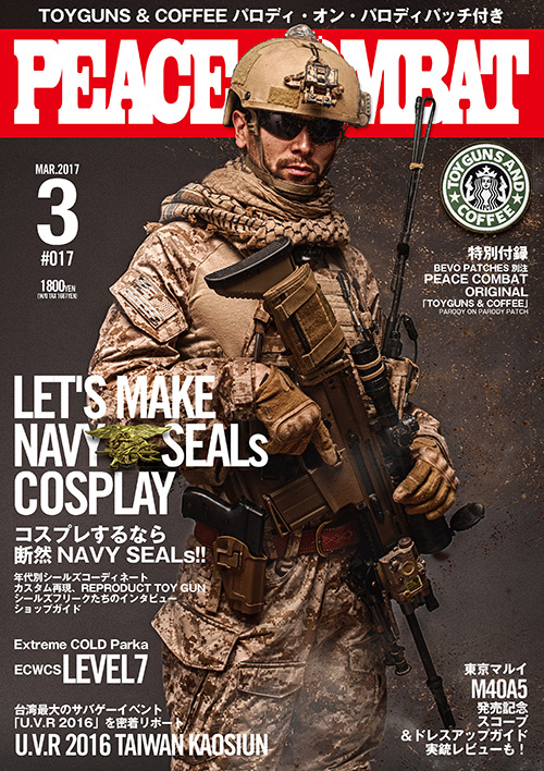 今号はSEALsコスプレ特集と称しまして、各年代別のSEALの装備解説、再現トイガン化、特殊部隊装備が揃うショップガイドなど、SEALsファンにはたまらない1冊となりました。インパルスの板倉さん、VOLKの高橋さん、MIL FREAKSの北川さんなど様々な方のインタビューも必見です。いかにもPEACEらしいといいますか、なかなか他にはない切り口になったんじゃないかと思います。