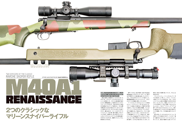 東京マルイのM40A5特集。もうフィールドでもちらほら見かけますね。新発売のM40A5に合わせるスコープ含め、外装カスタム提案です。なんと、RECOILマガジンとの業務提携の実銃リポートも、M40A1とM40A5。