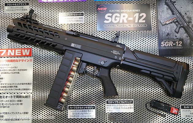 2016年11月に開催された東京マルイフェスティバルで発表された3発同時発射フルオート電動ショットガンSGR-12とは微妙に形状が異なっています。