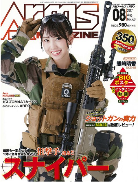 それでは、6月27日に発売されます2017年8月号をご紹介させていただきます。カバーガールは7月19日リリースの新曲「意外にマンゴー」で選抜メンバーとして活躍している「SKE48チームEの熊崎晴香さん。熊崎さんにはフランス外人部隊のスナイパーをイメージした装備を着用してもらいました。ちなみに熊崎さんがお持ちの銃は、AYのASW338LMロングキーモッドです。