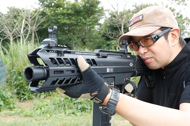 夏前は各社の新製品が続々リリースされる。今月号の注目の新製品は、東京マルイの電動ショットガンSGR-12とG&GアーマメントのARP9。どちらも発売前から話題になっており、私も気になっていた。まずはSGR-12。アサルトライフルのようなフォルムのボディは機能的・実戦的にデザインされているが、実際に手にしてみると、密度感・重量感に圧倒される。3発同時発射、しかもフルオートで撃つとと、あっという間に弾がなくなる。AA-12用電動ドラムマガジンが共用できるので、買い揃えておいて損はない。弾は適度に散開するので、中近距離における面制圧力は他を寄せ付けない。