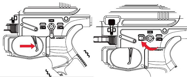 バースト切り替えはセミオートにしてトリガーを10秒引く。切り替わるとグリップが振動し、切り替え完了。
