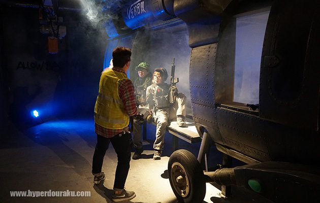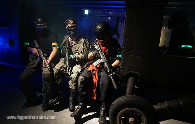 ヘリのキャビンで待機するグリーンチーム。スモークも炊けるので雰囲気抜群。