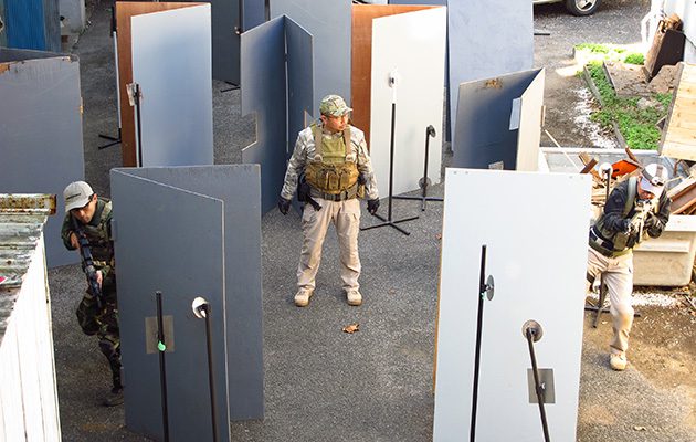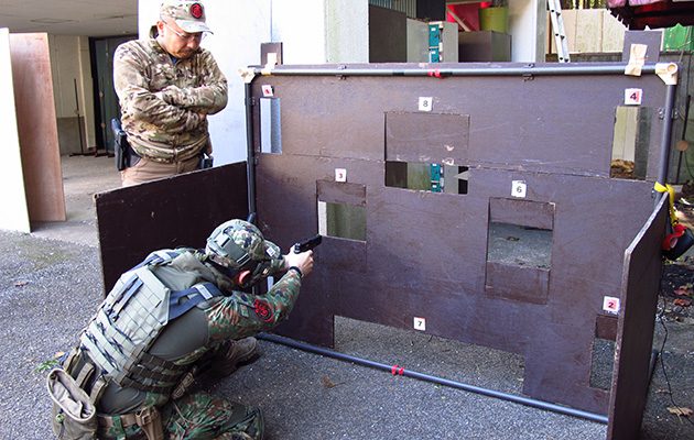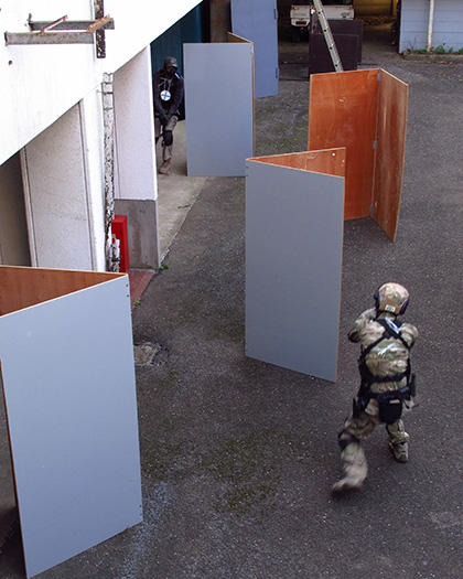 うまくバリケードを利用できているか、正確な射撃ができているかを確認するには、撃ち合ってみることも重要である。エアソフトガンだからこそ、このような実戦的な訓練ができる。