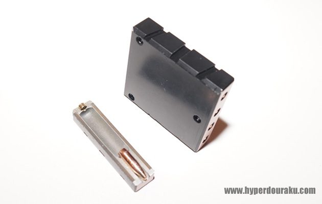 側面に飛び出たボックスマガジンにカートリッジを最大7つセットできます。