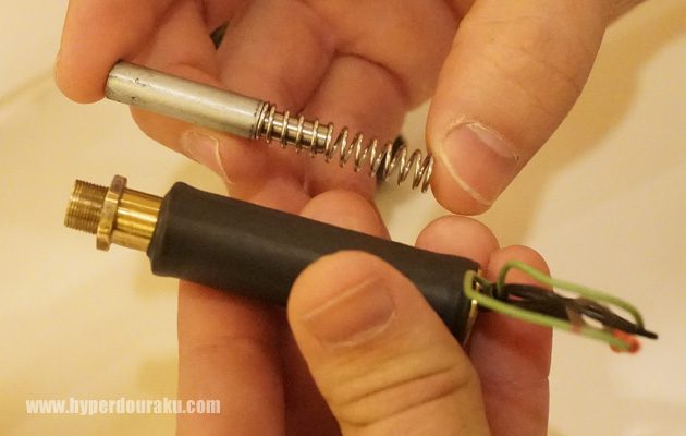 コイル内部はこんな感じ。実際には銀色のウエイトがスプリングの力も借りて前進し、レシーバー内のストライカーを押す仕組み。