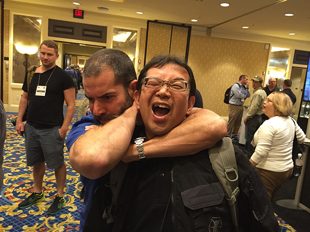 2枚目が、2015年に行った際に、日本でもお馴染みのクリス・コスタ氏と会場で会った時のもの。ショットショーの10日ほど前に開催された「クリス・コスタ ジャパンフェア」でお会いしたばかりだったので、コスタ氏も私のことを覚えていてくれて、こんなショットを撮ってくれた。今度取材に行く機会があったら、どんな有名人に会えるのだろうか…。