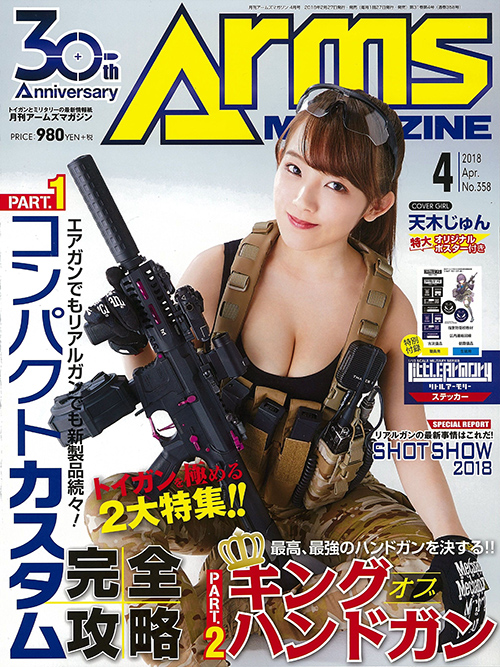 それでは、2月27日に発売されます2018年3月号をご紹介させていただきます。カバーガールは身長148cmと小柄ながら、Iカップの「奇跡の二次元ボディ」を称され、先日写真集を発売したばかりの天木じゅんさん。今回はG&GアーマメントのARP9ブラックオーキッドも持って、迷彩服はもちろん武装メイド服も披露してくれました。