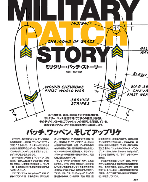 巻頭特集は軍隊とは切っても切れないパッチを様々な角度から考察する「ミリタリーパッチ大研究」をお送りします。米軍を中心に、WWⅡドイツ軍や英軍などのショルダーインシグニアを紹介する゛ミリタリーパッチ・ストーリー」。さらに「世界のミリパッチ図鑑」ではイラク特殊作戦部隊“I.S.O.F.”の珍しいパッチを掲載。