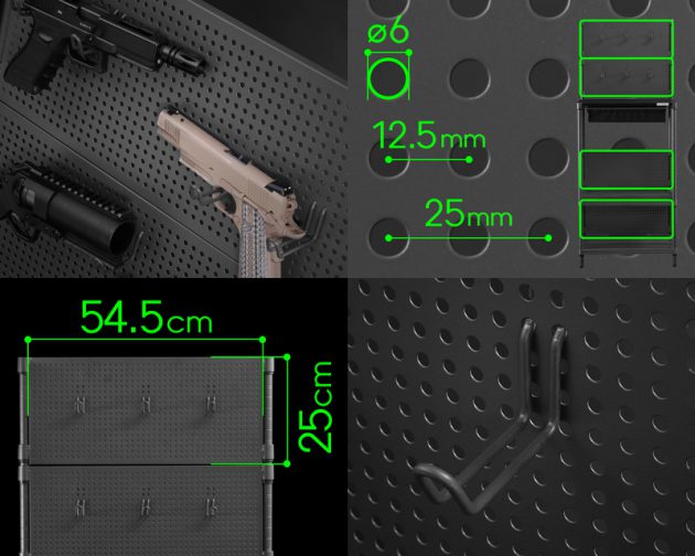 パンチングボードを用いてハンドガンやカスタムパーツの引っ掛け収納が可能。