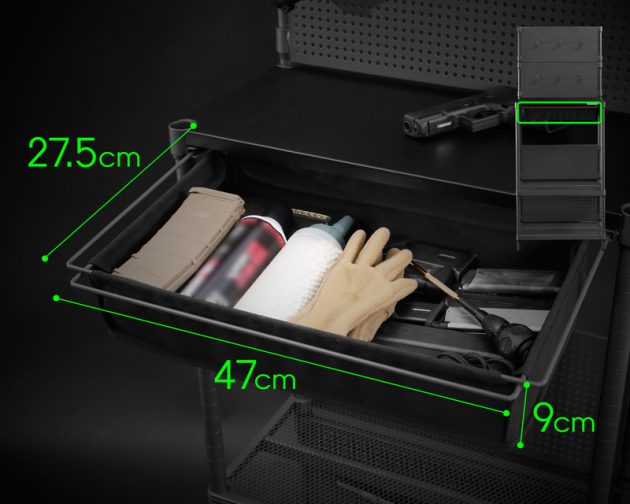 製品全体はハンドガンや装備を引き立てるダークグレーですが、天板と引き出し部分のみ、パーツや工具を目立たせ、汚れが目立ちにくい黒色を採用しました。