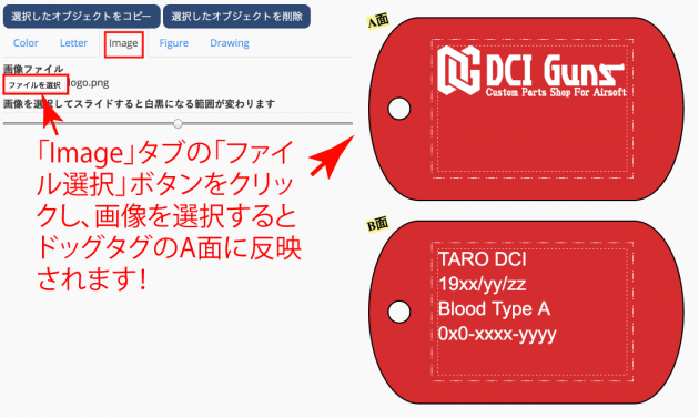 大手衣料品メーカーでオリジナルTシャツを作るかの如く、DCI Tags上でドッグタグのデザインを自由に決めることが出来ます