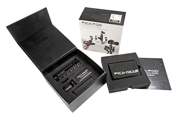 また、ピカティニー規格に加え、撮影機材で一般に使われている1/4”ネジ(カメラネジ・小ネジ)や3/8”ネジ(大ネジ)にも対応したユニバーサルデザインであること。モジュール式で撮影者の使い勝手が良いように自由に組み替えできること。更には、空洞の本体内に付属の三脚を収納できたり、そこに各種ケーブルを通して配線をすっきりしたり、細かなところまで配慮されたデザインはPICA-POD最大の魅力です。