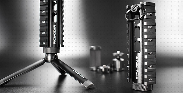 このPICA-PODの最大の特徴はピカティニーレールを纏ったその形状。アルミ6061で作られアルマイト処理されたボディは、ミリタリーテイストを存分に出しながら、カメラなどの撮影機材との相性もばっちりで高級感のあるデザインになっています。