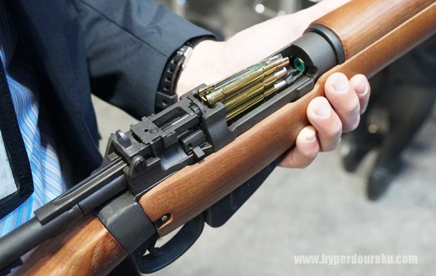 面白いのが二種類のマガジンを採用している点で、ひとつはレシーバー上部から弾薬の形状をした金属製マガジンを押し込むタイプと、一般的なボックスマガジンタイプがある。