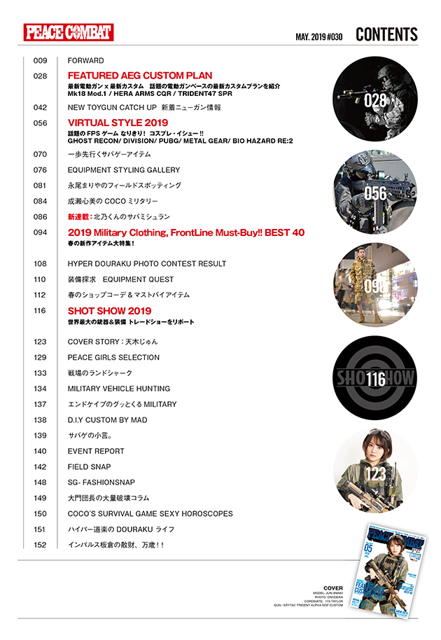 なんと今号のカバーガール、天木じゅんさんのインスタのフォロワー数は100万人オーバー。PEACE COMBATも彼女に宣伝していただきました。目指せ!100万部!