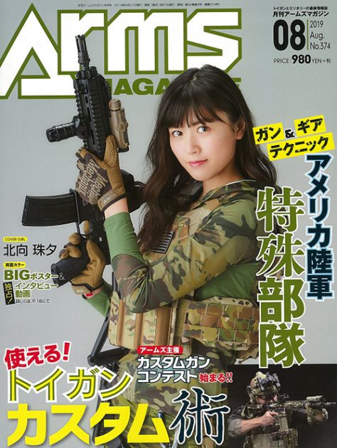 それでは、6月27日発売の2019年8月号をご紹介させていただきます。今月号の表紙は北向珠夕(きたむき みゆ)さん。古くはアグネス・ラムさんや松嶋菜々子さん、片瀬那奈さんなどを輩出した旭化成キャンペーンガールの第43代目(2018年度)を務めた経歴の持ち主です。陸軍特殊部隊の活動が活発なアフリカで平和維持活動に従事するアメリカ軍特殊部隊女性兵士をイメージしたスタイルでキメてもらいました。