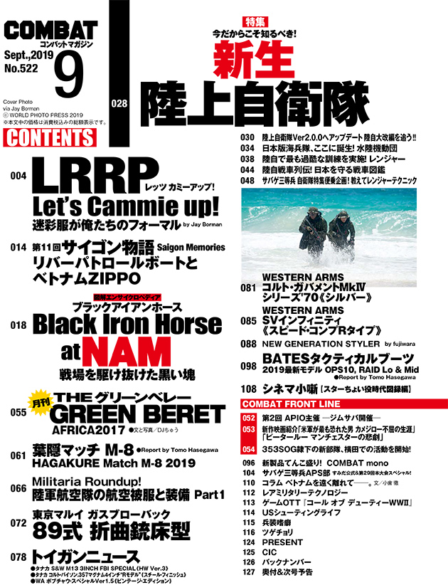 未だ梅雨が明けていないようですが、はっきりしない天気でも元気にサバゲ、楽しんでいることと思います。天気は今ひとつですが、湿度も高く、また曇っていたからと言って、熱中症や脱水症状には気をつけてください。さて今回は改編が進む自衛隊を大特集しています。もちろんトイガンあり、ミリタリーあり、ベトナム戦争特集だって元気いっぱいに、まだまだ続きます。