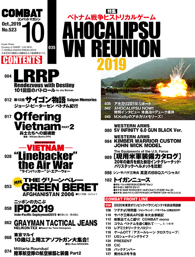 夏休みもあと少し! 前半は猛暑続きでしたが、やっと落ち着いてきて、朝晩は過ごしやすくなってきました。サバゲやリエナクトなど、屋外イベントなどに参加するのにも、楽になって生きて、これからが本番って感じです。さて今回はそんな日本最大級の屋外イベントである、NAM戦リエナクト、「アホカリプス」を大特集! もちろんトイガンあり、ミリタリーあり、ベトナム戦争特集だって元気いっぱいに、まだまだ続きます。今年もあと4ヵ月、残りも全力で突っ走っていきます。
