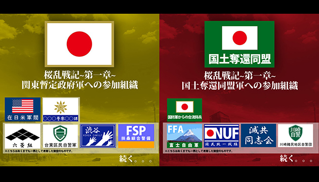 それに対し、「分断による諸問題を解決する事」を大義名分とし、北関東の奪還(と言う名目の縄張りの拡大)を望む急進派勢力「国土奪還同盟」が軍事的イニシアチブ確保のために、武装蜂起。