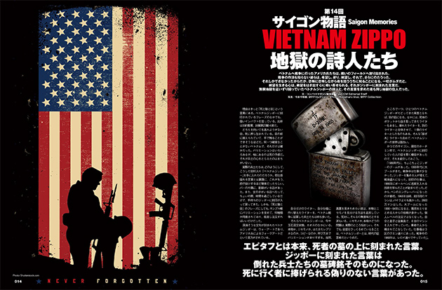 ホーチミン市(南ベトナム時代の首都・サイゴン)の今を訪ね、NAM戦当時に思いを馳せるシリーズ「サイゴン物語」。今回は日用品でありながらアートにまで昇華した、様々な図柄を彫り込んだZIPPOライター、ベトナムZIPPOに刻まれた、まるで詩のような文言を集めた。