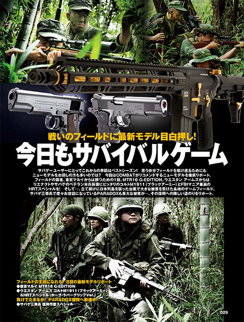 サバゲをするのにピッチリの季節が到来! そんなサバゲ・ベストシーズンに、エアソフトガン・ニューモデルが登場! まず東京マルイの最新モデルは、各所にゴールドパーツをあしらったガスブローバックM4カスタム、「MTR16 G-EDITION」。そしてお台場で開催された全日本模型ホビーショーでその他の最新機種を紹介する。そして鋭いキックとリアルな仕上げが魅力的なWAからは、大容量マガジンでサイドアームに、もちろんメインウエポンにも使える、HRTスペシャル《ホーグ・ラバーグリップVer.》と、米軍ベテラン・コスにもってこいのコルトM1911〈ブラックアーミー〉がリリース。