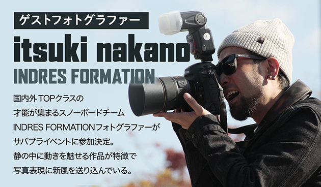 今回のイベントでは国内外問わず世界中から注目されている、TOPレベルの才能が募るスノーボードチームindres-formationからフォトグラファー中野樹をイベントに招待し撮影を行います。