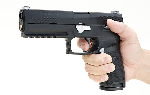 もし東京マルイがP320を発売するなら電動ハンドガンではないかと私は思っていました。実銃の構造上、メカボックスが収納しやすいと思ったからです。しかし、実際にはガスブローバックガンとして登場することとなり、予想は良い形で裏切られました。あらためてP320を握ってみると、ガバメントに近いナチュラルなグリップアングルとあいまって構えやすく感じました。トリガーもグロック17などに比べて引きやすく、アメリカ軍に制式採用されて以降、人気が急上昇しているのもわかります。どことなくP226の雰囲気を残す外観は好みがわかれるところですが、P226が好きな私は好きな部類に入ります。ブローバックのフィーリングもサンプルとは言え申し分ないものでした。