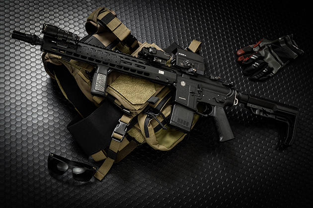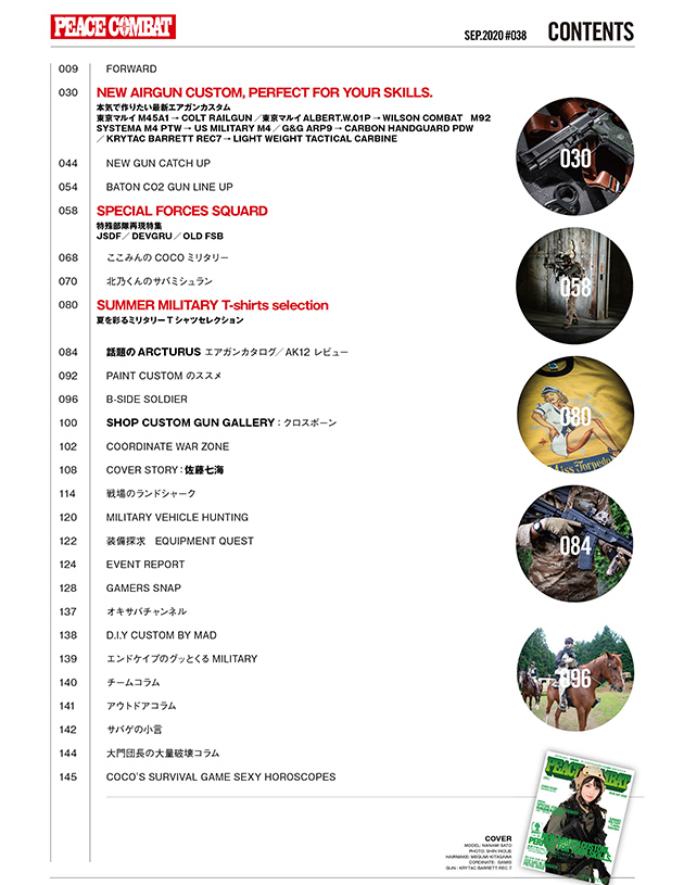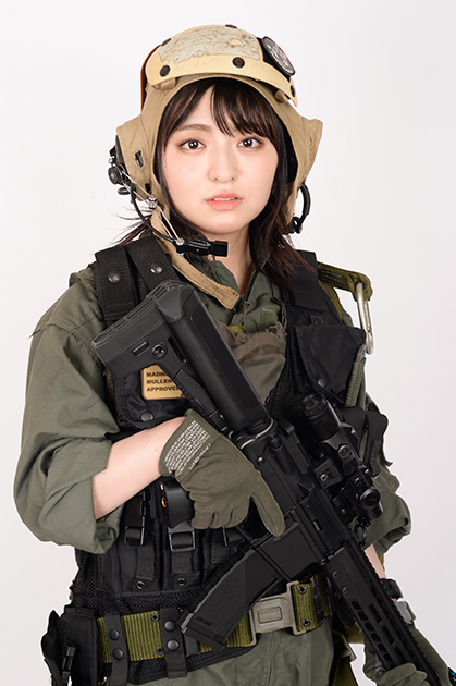 今号の表紙は、去年AKB48を卒業したばかりという佐藤七海さんにお願いしました。衣装は2000年代初期のVBSS装備のSEALsオペレーターをイメージした衣装ということです。被り物がいい感じに萌えてて、好印象ですね。銃はKRYTACのBARRETT REC7です。時空を超えたSEALsオペレーターということで、銃は最新鋭のM4カスタムとなっています。まぁ、可愛いのいいでしょう。