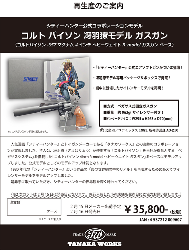 タナカ コルトパイソン 冴羽両モデル ガスガン再販 2021.02.17 ニュース・告知 タナカ コルトパイソン 冴羽両モデル ガスガン再販。 2021年2月16日発売、35,800円(税別)。 提供:フジカンパニー この記事が役に立ったら、ぜひシェアしてください。 Post 関連記事 2016.12.10 クライタック・オーナーズ・ミーティング開催!! 2016.11.07 ミリワンフェスティバル2016&陸上自衛隊・防災コンベンションin浜松 開催 2021.01.30 カーボネイト第4弾 グロック17系統カスタムモデル「ストライカーナイン」新登場 2016.10.27 アクション映画専門映画祭『シネマジャンクション2016』の上映授賞式が開催 関連アイテム 【2025年10月新商品】東京マルイ P320 32連 ロングマガジン スペアマガジン 予備 ガスブローバック BK SIG SAUER シグ ザウエル… 5,478円 【2024年8月新製品】KSC マカロフ 9連マガジン システム7 マカロフPM HW 対応 エアガン 18才以上 銃 サバゲー ガス ガスブロー… 3,800円 【楽天1位!】東京マルイ P320 スペアマガジン 予備 ガスブローバック BK SIG SAUER シグ ザウエル シグザウアー M17 ハンドガン… 4,280円 新製品予約 3月中旬頃 BATON Airsoft GLOCK G19X CO2 マガジン GLOCKライセンス バトンエアソフト エアガン バトンエアソフト … 7,980円 新製品予約 3月中旬頃 BATON Airsoft GLOCK G19X MOS CO2ガスブローバック GLOCK社ライセンス バトンエアソフト エアガン バト… 31,350円 Supported by 楽天ウェブサービス もっと「エアガン 新製品」を、 楽天市場で探す | amazonで探す