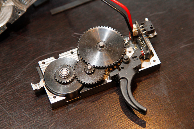 取材のために超小型ブラシレスモーターを見させていただきましたが、思わず声を出してしまうほど小さく、今までの電動ガン用モーターの常識を覆すものでした。PTWインフィニティの特徴はこれだけではありません。電子制御基板との組み合わせにより自己学習機能が追加され、スプリングレートの異なるシリンダーを入れ替えても、所定の手順を行なうことでセクターギアを最適なポジションに自動的に調整します。さらに別売のカードを使うことで細かなセッティングできます。まさに至れり尽くせりです。