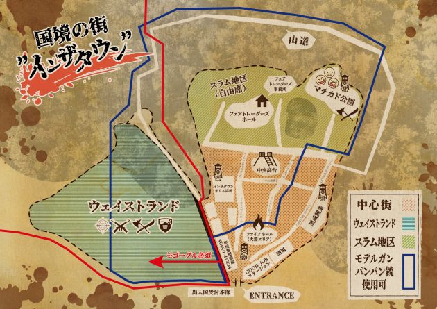 事前にMAPが用意されており、ウェイストランド(戦闘エリア)はもちろん、「酒場」、「仕事(クエスト)の斡旋所」等の様々なアクティビティの場所がわかるようになっている。