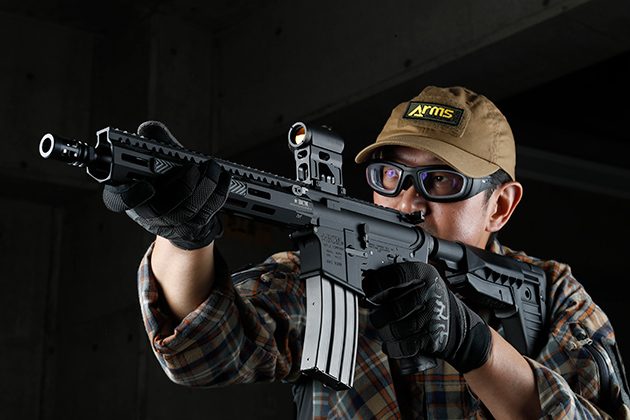 バレル長は今後のトレンドになりそうな11.5インチ。CQB-Rと14.5インチバレルのM4カービンの中間くらいのサイズで軽量さと相まって取り回しやすく、10インチのM-LOKハンドガードは各種アクセサリーのセットアップしやすそうだと感じました。内部にはVFCの電子トリガーシステム「Virgo」が標準装備されており、キレのあるトリガーフィーリングが味わえます。実際にサンプルを手にした結果、ミーハーな人間としては手に入れなければならないと思って予約しました。製品が到着するのが今から楽しみです。詳しい製品の特徴については7月号をご覧ください。