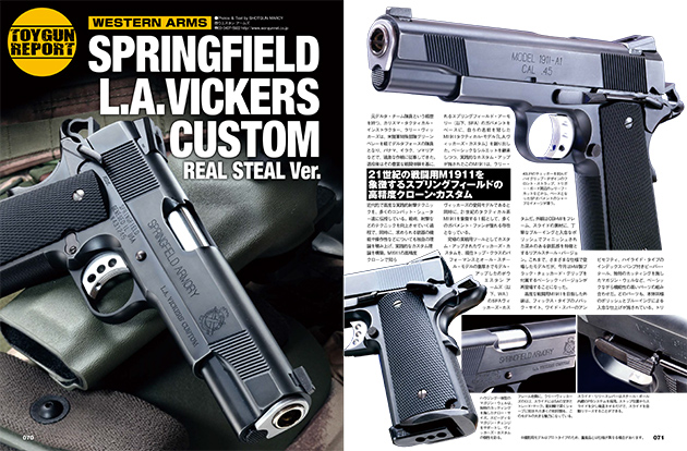 • 元デルタ・チーム隊員という経歴を持つ、カリスマ・タクティカル・インストラクター、ラリー・ヴィッカーズ。氏がその豊富な戦闘体験を基に、実践的なカスタム理論を構築し作り出したのが、自らの名前を冠したM1911タクティカル・モデル、L.A.ヴィッカーズ・カスタムだ。今月はそれを正確に再現したウエスタンアームズの「SFA L.A.ヴィッカーズ・カスタム/リアルスチール・バージョン」を徹底リポート。M1911らしい逞しさと、オール・スチール・モデルの重厚なムードを楽しむコレクションとしてはもちろん、最新のバージョン3メカにプル・バックシステムのスライド・リリースレバーを採用した高度な実射モデルでもある、まさに才色兼備の1挺!