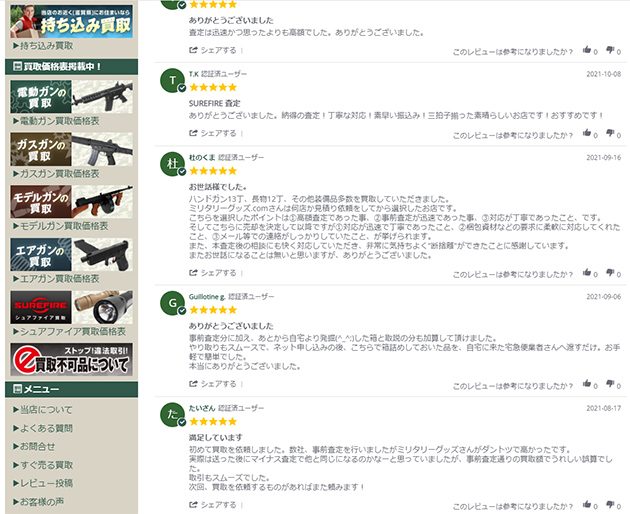 エアガン電動ガンの買取サイト『ミリタリーグッズ.com』では、買取時にお店のレビュー・口コミを書いていただいた方を対象に、通常の買取金額よりさらに500円増額するサービスをしている。