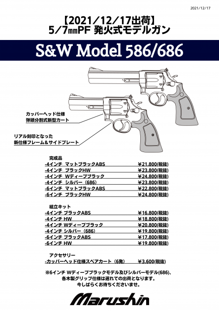 マルシン工業からS&W M586/686モデルガンが出荷! 2021.12.17 モデルガン マルシン工業からS&W M586/686 発火式モデルガンが出荷されました。 待望のリアル刻印化と新型カートリッジの新仕様だそうです。 6インチのWディープブラックとシルバーモデル、各木製グリップ仕様は後日出荷を予定とのこと。 この記事が役に立ったら、ぜひシェアしてください。 Post 関連記事 2014.04.11 誰でも楽しめる! モデルガンの世界!! 撃って! 撃って! 撃ちまくれ!! アソビットシティ 2021.12.17 伝説のPPCカスタムリボルバー「ストラウプPPCカスタム」モデルガン 2020.07.27 金属製モデルガンの売買について STGA通達文書 2022.07.14 タナカワークス コルト パイソン 冴羽獠モデルがモデルガンで2022年冬登場! 関連アイテム 東京マルイ H&K MP5A5 電動ガンBOYs [ サブマシンガン(対象年令10才以上) ] サバゲー 電動ガン ライフル マシンガン ネズミ除… 8,130円 東京マルイ スミス&ウェッソン PC356 [ 電動ブローバック フルオート/対象年令10才以上 ] サバゲー 電動ガン ブローバック ネズ… 4,353円 東京マルイ 18歳以上用 電動ハンドガン H&K USP ブラックカラー 【あす楽】 15,800円 東京マルイ ハイキャパE ガバメントモデル 電動ガン ハンドガンタイプ 【あす楽】 17,980円 東京マルイ対応 電動ガン 互換 ミニSバッテリー ニッケル水素 1600mAh【使用時間23%アップ】 [ランキング受賞] 1,969円 Supported by 楽天ウェブサービス もっと「電動ガン」を、 楽天市場で探す | amazonで探す