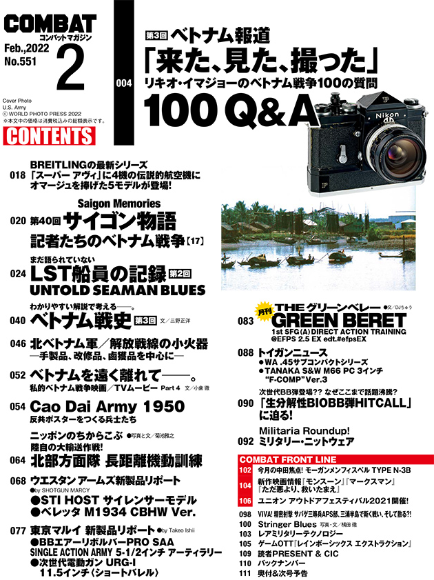 ●2021年10月号、12月号続く大好評企画の最終回! アメリカの通信社UPIの特派員として、ベトナムに入った今城力夫氏に聞く「ベトナム戦争100の質問」。Q&A方式のこの企画、今城氏の歯切れが良く、さらに答えの中に数々の発見があるから読み応えも充分! 特派員として、ベトナム戦争を撮り続けた男だけが知る戦場の真実を知るべし――。