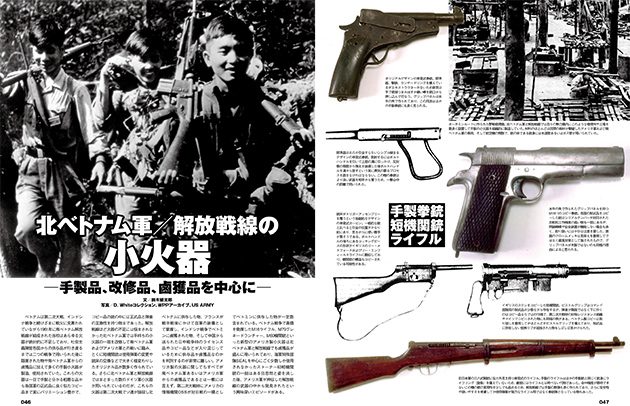 ●ナム戦マニアが狂喜乱舞した「北ベトナム軍/解放戦線の軍装」に続いてお届けするのは北ベトナム軍と解放戦線の小火器。第2次世界大戦、インドシナ戦争と続けざまに戦火に見舞われた南ベトナム解放戦線は、結成当時、あらゆる火器が不足しており、南ベトナム軍からの鹵獲品や多くの手製小火器が製造され、使用されていたという。これらを当時の写真で分かりやすく解説。小火器から手製手榴弾、梱包爆薬まで、まさにマニア必見、資料性抜群のリポートです!