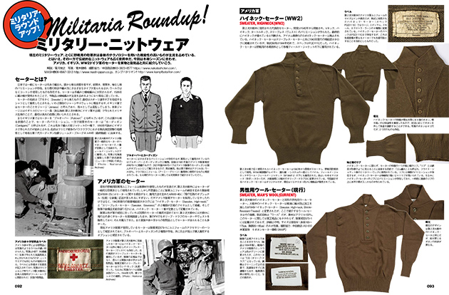 ●マニアのための資料集でお馴染みの本連載。今回はミリタリー・セーターがテーマ。現在の野戦用のミリタリーウェアは最新のテクノロジーを用いた機能性の高いモノが主流。とはいえ、その一方で伝統的なニット・ウェアも広く使用中だ。今回はアメリカ、イギリス、WW2ドイツ軍のセーターを実物と復刻品を織り交ぜて紹介。これからのシーズンのファッションの参考になりますよ!