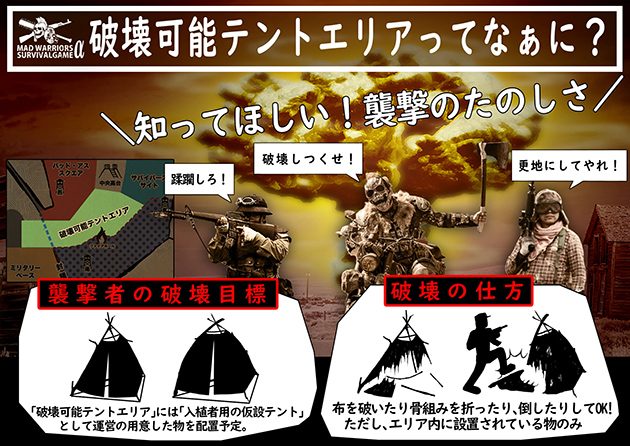 今回のイベントではテーマキャンプとは別に戦闘時に破壊可能な仮設テントが運営により用意されており、「集落を守る住人」と、「襲撃者」を3つのグループの中から交代でゲームを行い、襲撃者になった時に指定のテントを破壊可能だ。