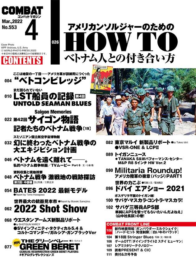 今月はモリモリのベトナム企画だけでなく、中田商店が取り扱う人気タクティカルブーツ「BATES」の最新モデルの紹介や、世界最大の銃器見本市「ショット・ショー」の模様など月刊誌らしいネタも満載でお届けするバッコン! バッコン!