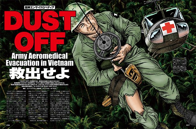 ●ベトナム戦争では戦場で負傷した兵士の多くは、緊急の医療処置を受けるために必死だった。「DUST OFF!」を要請すると、負傷兵を危害から遠ざけるためにの医療避難ヘリコプターが出撃する。これに対してアメリカ軍は負傷兵の回収のための特別任務を指定し、コールサインを「DUST OFF」とした。ベトナム戦争で実際に粉われた救出作戦をM.Kellyのイラストで解説!