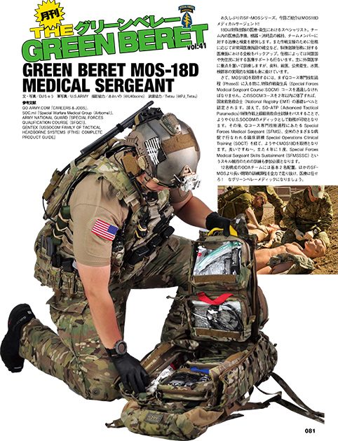 ●今回はお久しぶりのSF-MOSシリーズ。ご紹介するのはチーム内の医療品準備、機器・消耗品の維持、チームメンバーに対する治療と検査を提供する、特殊部隊の医療・衛生におけるスペシャリスト「MOS18Dメディカルサージェント」。さらに新たに開発された特殊部隊支給の最新ヘルメット「FTHS:Family of Tactical HeadborneSystems」についてもじっくり解説!