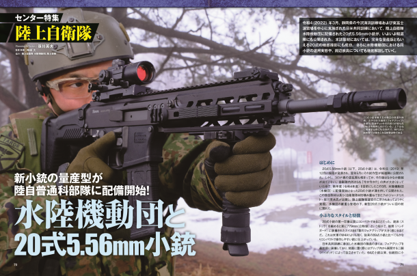 センター特集は「陸上自衛隊」。先月号では新拳銃ヘッケラー&コックSFP9の錬成射撃訓練の模様をお伝えしました。今月号では令和4(2022)年3月、静岡県の今沢海浜訓練場と東富士演習場を中心に実施された日米共同訓練において、陸上自衛隊水陸機動団に配備された新小銃20式5.56㎜小銃の取材に成功。細部の特徴や運用実態について詳しく本誌ライターが徹底解説しています。