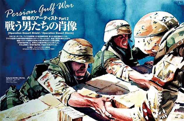 ●1991年1月17日、アメリカ陸軍第101航空師団所属、第101航空連隊のヘリが、アメリカ空軍の4機の特殊作戦用MH-55ペイブローとともに、高速で低空を飛行しながら、現地バグダッド時間0236時(午前2時36分)に攻撃を開始。「砂漠の盾作戦」は、未明のこの航空作戦とともに終了したが、それは同時に「砂漠の嵐作戦」の始まりを告げていた――。当時の米陸軍アーミーアートチームによる戦う男を描いた貴重なアートワークを全h号に続いてたっぷりお届けします!