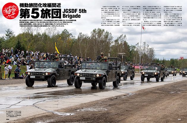 、そして新装備の配備と、編成だけでなく見た目も大きく変わろうとしている。有事ともなれば迅速に部隊を展開し、任務に当たるべく、全国の師団及び旅団を機動化改編しているのもそのひとつ。今月は2023年3月に機動旅団化改編される第5旅団をクローズアップします!