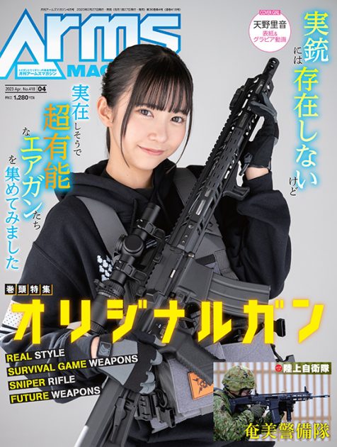 それでは、2月27日発売の2023年4月号をご紹介させていただきます。昨年の秋、女性アーティストやタレントをファンが応援するアプリCHEERZ(チアーズ)にて、月刊アームズマガジンのカバーガールの座を賭けたコラボ企画が開催。その結果、ランキング1位に輝いた天野里音さんに表紙&グラビアを飾っていただきました。さらにグラビアページでは上位ランカーとなった志柿じゅみさん、飯田愛梨さん、鈴音ひとみさんがそれぞれ違うテーマのスタイリングで誌面を彩っております。推しのファンの方はぜひお手に取ってご覧いただければ幸いです。