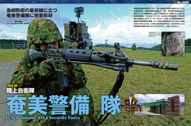 PICK UPは「陸上自衛隊」。今月の自衛隊レポートは主要な島嶼のひとつである奄美大島に新編された奄美警備隊へ密着取材。今回は同隊の全面協力により、レーダーやドローンを用いた沿岸監視訓練や中距離多目的誘導弾の展開、そして最新の覆道射場における9mm拳銃、20式5.56mm小銃、5.56mm機関銃MINIMI、M24 SWSによる射撃訓練の模様を捉えることができました。